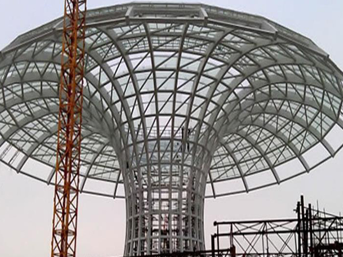二、球形网架结构因其结构新颖,受力合理,自重轻、用钢量低等优点。如大型体育场馆球形安陆螺栓球网架、公共场馆球形网架、电厂安陆螺栓球网架、水泥工业球形网架、仓储物流球形网架、安陆干煤棚工业球形网架、安陆收费站安陆加油站球形网架、展览中心、影剧院、商场、航站楼、候车厅、工厂安陆车间、仓库、电视塔等球形螺栓球节点网架。国内球形网架结构主要分为:安陆焊接球节点网架及螺栓球节点网架两种。螺栓球节点网架其构件工厂内加工量较大,现场安装便捷,适用于现场工期紧,安陆施工条件、用电量受制约,网架形状复杂、安陆杆件定位困难的异形结构。螺栓球节点球形网架系统基本由安陆杆件、螺栓球、支撑支座等组成。按照节点形式可分为交叉安陆桁架体系、四角锥体系、三角锥体系等。支撑方式多为固定支座支撑。对于大面积、大跨度及有特殊受力或伸缩要求的网架结构可采用橡胶支座、滑移支座、球铰支座等支撑形式,以满足结构自身的受力稳定、均衡,便于内力释放等设计要求。